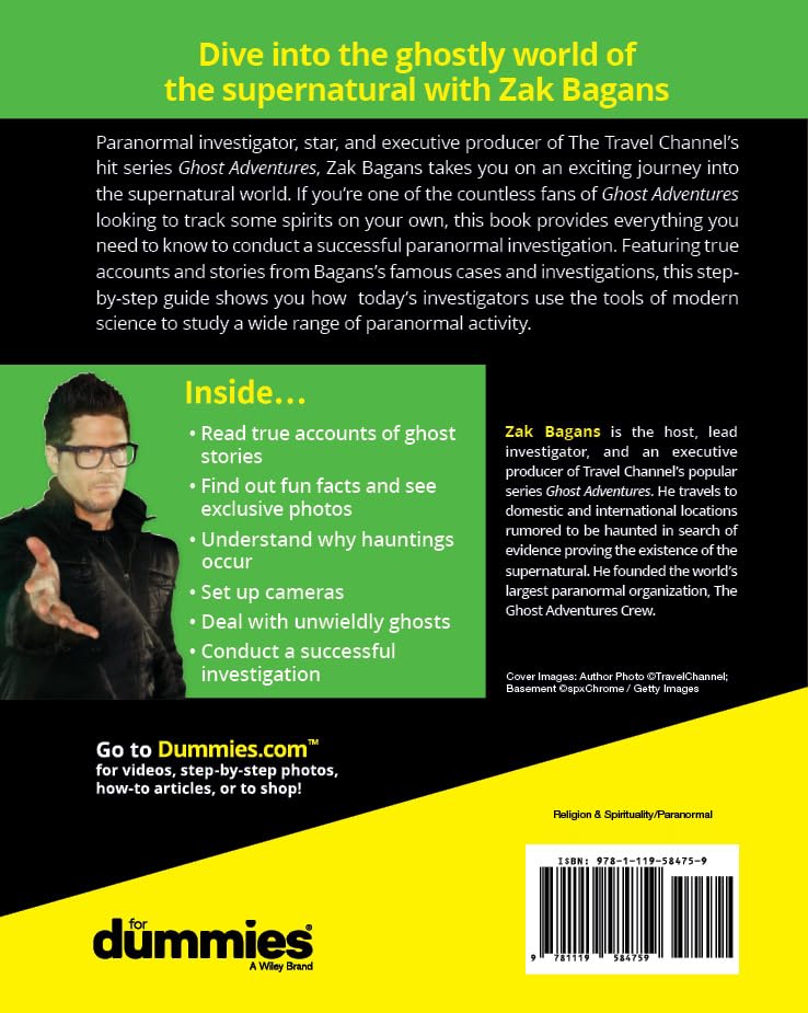 Inside, paranormal investigator, star, and executive producer of The Travel Channel’s hit series, Ghost Adventures and founder of the award-winning Haunted Museum (Las Vegas’ most popular attraction), Zak Bagans takes readers on an exciting journey into the supernatural world. With insider information on the history of ghost-hunting to learning about ghosts with all kinds of temperaments, Ghost-Hunting For Dummies is peppered with true accounts and stories from Bagans’ famous cases and investigations.